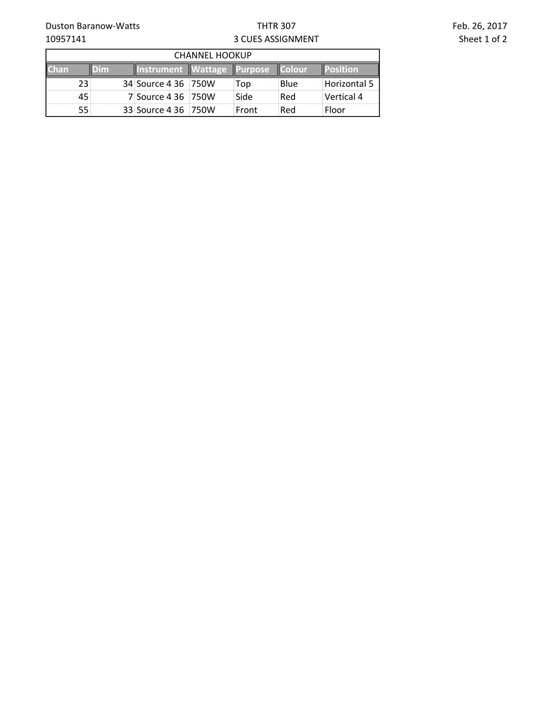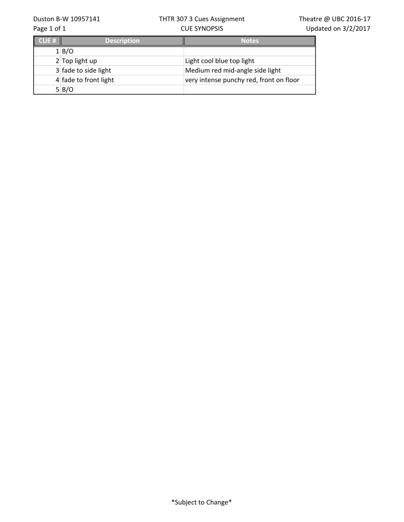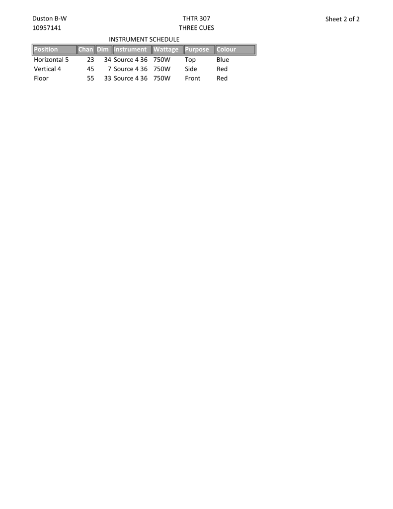 Assignment to create three lighting cues using three instruments for an introductory lighting design class (THTR 307) at UBC Vancouver in the Dorothy Somerset Studio Theatre.